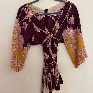 Rebecca Taylor sz 0 silk kimono style blouse w/ tie, burgundy pink and marigold