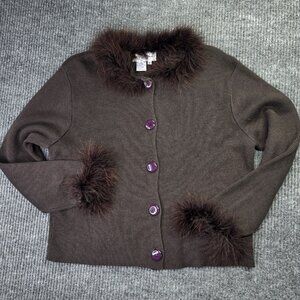 Rebecca Thomas Sweater Womens Medium Brown Feather Trim Cardigan Button Up
