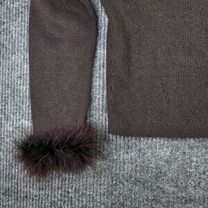 Features a classic brown knit design with a luxurious feather trim at the collar and cuffs