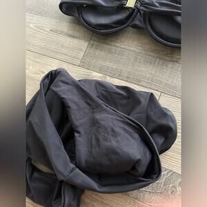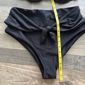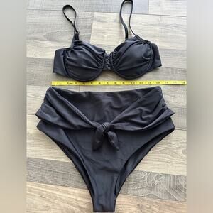 Top and bottom size large bikini underwire padded top with high waist bottom swimsuit. The inside has some sticky glue due to sticker lining. Normal wear.