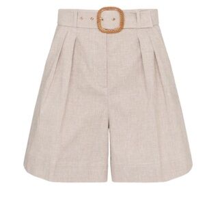 As temperatures rise, ensure your looks stay cool with the beige Zohra shorts from Rebecca Vallance. Made from breathable cotton and linen, they have a structured silhouette with a belted waist and pleated, wide-cut legs.