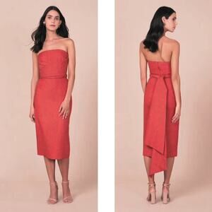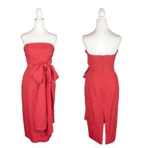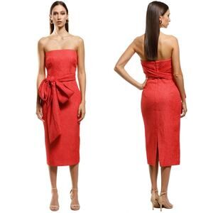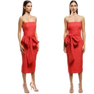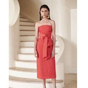 Rebecca Vallance Francesca Midi Dress excellent pre loved condition size 6 retail $729 The perfect hire for cocktail parties and wedding receptions, the Francesca Tie Midi by Rebecca Vallance is sophisticated and effortlessly chic! Rendered in a stunning coral hue, the midi dress features a strapless neckline and a fitted bodice with a built-in internal bra and boning for added structure. Functional ties at the waist can be styled in various ways and is the perfect way to show off your personal style. Zip fastening Lined Back vent NOTE: Hook & Eye at top of back zipp is loose and needs a few stitched to reattached - easy repair color: red C9 tags: formal wedding guest special occasion medium black tie quiet luxury