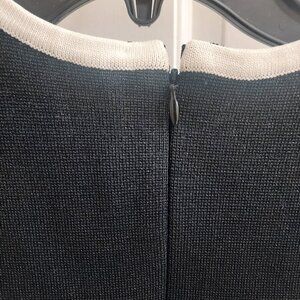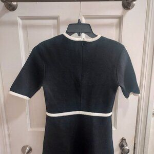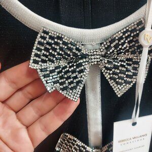 Black shimmer knit short dress with white trim and crystal bow details on upper