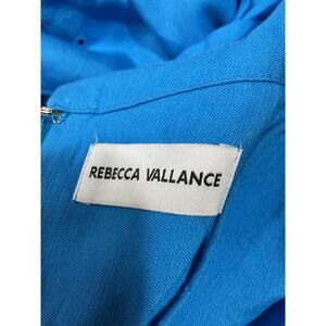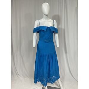 Rebecca Vallance 'Isidora' Blue Belted Linen & Cotton Midi Dress Size 2 US / 6 AU: cotton, cut-out detailing, square neck, crossover strap detail, short front button fastening, belted waist, sleeveless, tiered skirt and scallop edge.