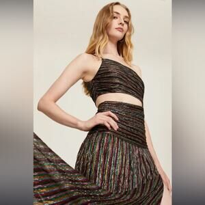 Pleats play with this beautiful drop waist gown by Rebecca Vallance. Let the waist cut out and thigh-high slit shine at your next gala.