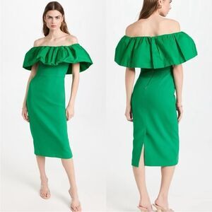 Brand new without tags Retail $590 A voluminous taffeta ruffle tops a dramatic off-the-shoulder sheath dress elegantly tailored from textural stretch crepe. 40" center front length Off-the-shoulder neck Short sleeves Lined 98% polyester, 2% spandex