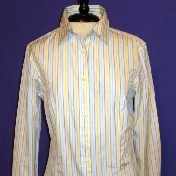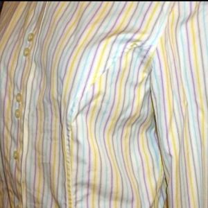 Another amazing dress shirt by Rebecca & Drew. Clearing out several high-end dress shirts I just don't wear anymore for some odd reason! Open collar. Twinned buttons at the bust do NOT gap a bit. Tailored & feels custom made. Single barrel cuffs. Pretty yellow & purple stripe. So great for layering with a bright cardigan & chunky necklace. In perfect condition. Was a size 6-8 when purchased online. Size 34D