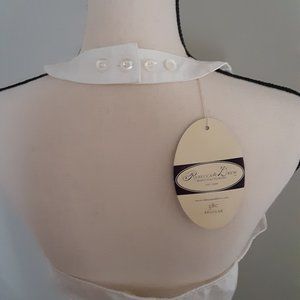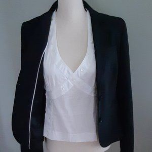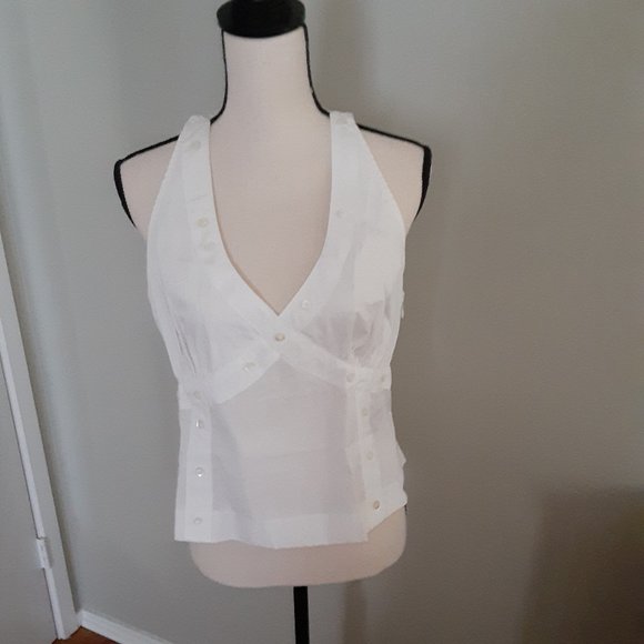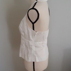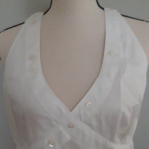 Nice, neat, fitted white halter top with side zip and nice button detailing front and back; size 38C; 100% cotton; adjustable neck button closure. Front measures 17" wide at waist, 19 1/2" across hemline; 10 1/2" underarm to hem. Nice comfortable dress-up for a plain jacket.
