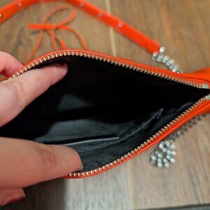 Used Rebecca minkoff mini 5 zip in poppy red/silver hardware. Ink transfer on back (see pictures) and tassles, includes new tassle