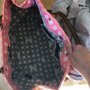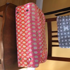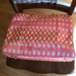 Rebecca minkoff pink/orange/beige M.A.B. large tote, with silver hardware & dual rolled leather shoulder straps for lasting durability and style. One outside concealed zip pocket & 3 inside pockets of which one is also zippered. Protective feet at base & magnetic snap closure at top. Note inside with small stain- didn’t notice until listed. 16” widex12L x 4.5” deep, 7.5” hang on shoulder strap. Overall guc. Includes dust bag.