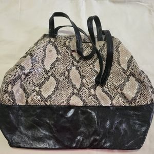 This Rebecca minkoff bag is in great shape. It is a giant soft tote. It can be folded and put into another bag. It is black on the bottom with snake pattern at the top. About the size of a standard bed pillow.
