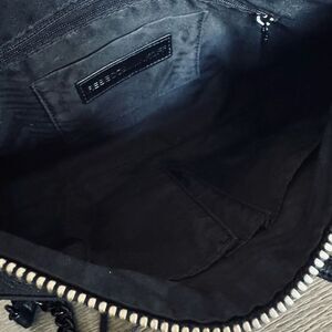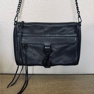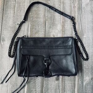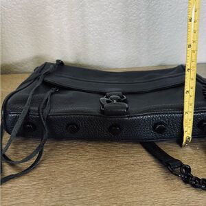 Rebecca Minkoff genuine leather solid black studded detail crossbody purse bag with black chain strap and signature clip latch exterior with long leather tassel zipper pills. Great preowned gently used condition with a few normal signs of wear mainly on the zipper hardware. Zippered main compartment with multiple side pockets for storage and organization inside and out. Clean inside, from nonsmoking home.