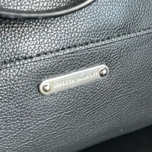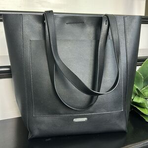 Rebecca Minkoff leather tote, black shoulder bag, work tote, travel carryall, minimalist leather handbag.