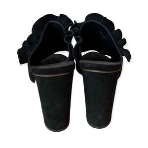 Description: 4" Round Block Heel, Suede, Ruffle, Slip On Mule