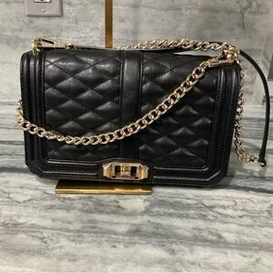 Rebecca Minkoff quilted love crossbody bag, gold tone hardware.