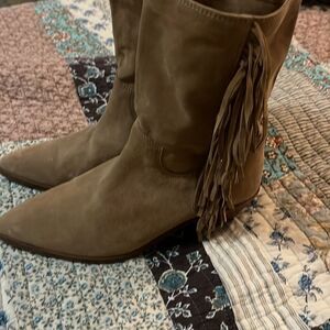 Rebecca Mankoff, leather suede boots with fringe on each side tan color only worn 3 times so in very good condition size 8 1/2 medium