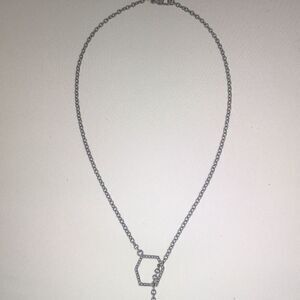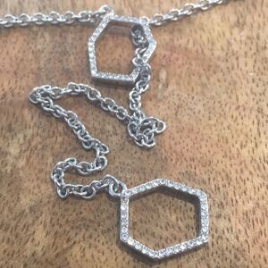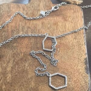 Glittering hexagons serve as fixed anchors for this silvery nonslip Necklace inspired by the lariat. 15” length, 7” Drop. Lobster clasp closure. By Rebecca Minkoff.