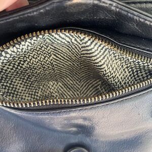 Black leather crossbody bag. Zip closure. Metal feet. Chain strap with studded leather shoulder piece. Back side has one zip pocket with a flap and metal hook clasp closure. Inside has one slip pocket. Inside shows some ink stains in the corner as shown. Hardware shows some wear as well. Leather shows some wear around corners.