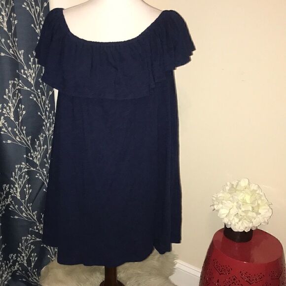 Great, preloved condition. Rebecca Minkoff Off-The-Shoulder Tunic Top. Ruffle detail along the top. Keyhole cut out in the back. 100% cotton.
