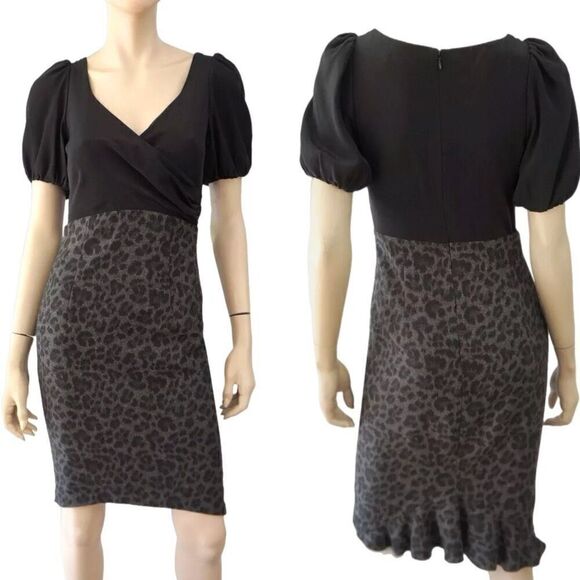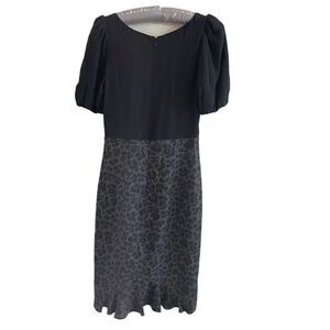 Rebecca Taylor Cheetah Print Dress. This wool and silk sheath dress skims the body perfectly. It has a black silk top, gray and black cheetah print wool skirt with a ruffle hem at the back and a sexy neckline.