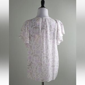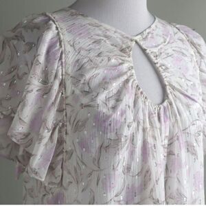 This elegant blouse by Rebecca Taylor features a delicate flutter sleeve design in a soft white hue. The ruched bib collar adds a touch of sophistication, while the cut-out details enhance its romantic charm. Perfect for adding a feminine flair to any outfit.