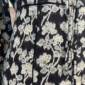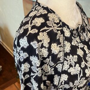 This charming floral dress in an airy fabric has voluminous sleeves, an open v-neck, and a feminine tie and button closure with free-flowing ease of movement.