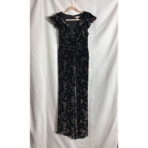 Rebecca Taylor velvet romper || size 4 || wide leg with cute fluttery sleeves || I’m a 6/8, this is snug on me but zipped fine, so would fit well on a 4 || like new condition || this is long- I’m 5’3 and wearing 4 inch heels in the photos, the hem still dragged on the floor || gorgeous purple floral pattern || pockets ||