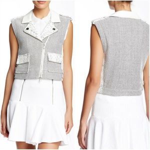 I’d love to accept your offer.Bundle to save 15% on 2 plus items.Be sure to follow along on Instagram @designerdressesforall to be notified . Tactile tweed updates this edgy moto styled in a cropped silhouette with leather trim and feminine lace