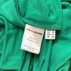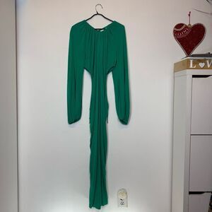Green jersey (100% Rayon Matte Jersey). Hourglass. Long sleeves. Crew neck. Back zipper closure. 54 from shoulder to hemline.
