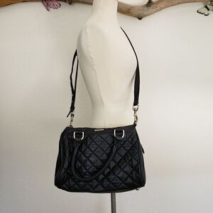 Includes cross body strap. Satchel style leather purse with smooth back and quilted front. Silver fixtures