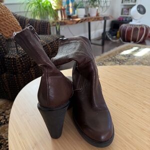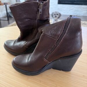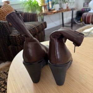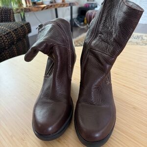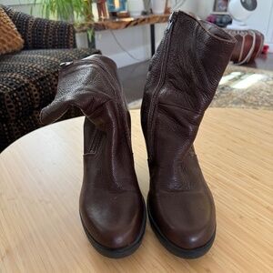 Size 9 (39), brown leather, inner and outer zipper boots, 4" wedge heel. Very good condition