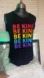 Black tee with 'Be Kind' in rainbow colors. Sleeveless design.