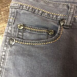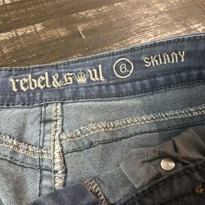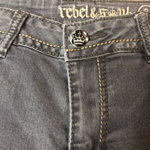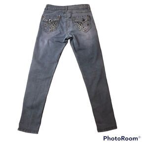 Rebel & Soul High Rise Skinny Faded Gray Wash Jeans Womens Size 6. Embellished back pockets jeweled and embroidered. Crown buttons on the front pockets. Good preowned condition.