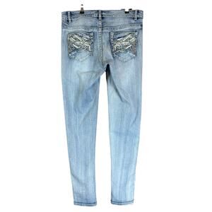 Details: Light Blue Stone Wash Skinny Jeans. Fading and Whiskering Accents. Back Pocket Embellished with Rhinestones and Embroidery. 5 pocket Design.
