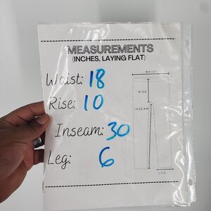 Inseam: 30 in; Rise: 10 in; Waist (flat): 18 in; Leg opening: 6 in (see measurement photo for specifics)