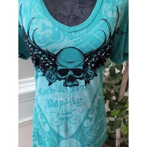 Rebel Spirit women’s graphic blouse is a bold statement piece featuring a turquoise base with striking skull, wings, and crown graphics. Embellished with rhinestones for extra edge, it blends comfort and rock-inspired style. Made from 100% cotton (exclusive of decoration), this tee is perfect for casual wear, concerts, or anyone with a rocker-chic vibe.