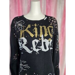 This limited edition Rebel Spirit King Studded Thermal Black T-Shirt is a must-have for any fan of music, grunge, metal, gothic, or hip hop. The long sleeve crew neck tee is made of comfortable and durable cotton knit fabric, which is machine washable. The shirt features a graphic print pattern with the word "king" in bold letters, surrounded by studded and embroidered accents, including the iconic Rebel Spirit logo.