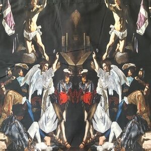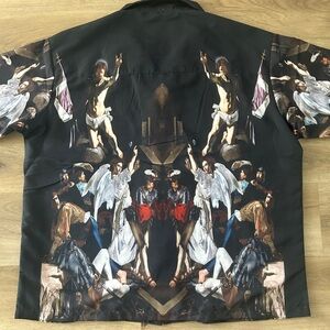 Standout Rebel Vengeance short sleeve button-up shirt, brand new with tags (NWT). Rare and hard-to-find piece featuring a mirrored Renaissance-style painting print across the front and back. Striking details with angels, warriors, and dramatic artwork give this shirt a bold, wearable-art look.