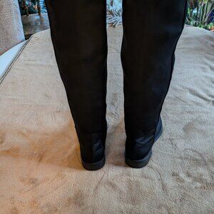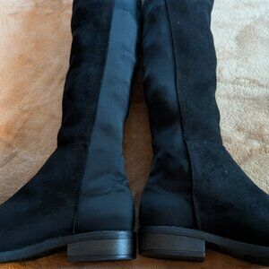 Rebel women's black textile / faux suede over the knee boot, size 6, pre-owned, good condition, no tears.Boot front height-21in, back height of boot 19 inches.