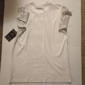 Graphic tee with skull surrounded by roses encrusted in rhinestones. Logo name encrusted with rhinestones also. Skull and crossbones print around the graphic and on both sides of the sleeves.