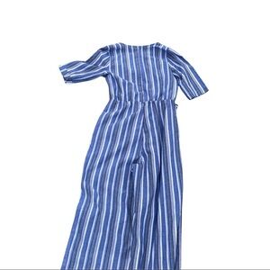Rebellion Again Light Blue, Cream, & White Vertical Striped Tie-in-Front 3/4 Sleeve 1/2 Zippered in Back Wide-Leg Jumper Romper Jumpsuit Women’s Size Medium with an Inseam of 28”. This jumper is preowned and in very good condition.
