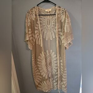 Elegant cream lace kimono. Intricate floral patterns. Lightweight and stylish.