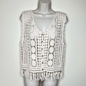 Rebellion Crochet Lace Fringe Button Front Cream Boho Vest Cotton Women Small