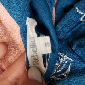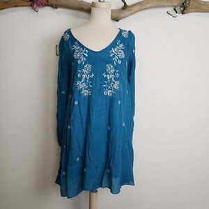 Oversized flowy and romantic blue with white embroidery. Embroidered flowy sleeves and large keyhole back. Lined. Can be worn as tunic or dress