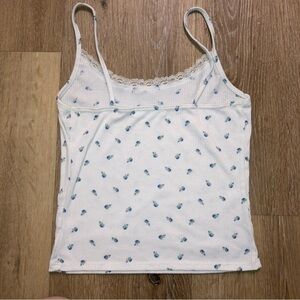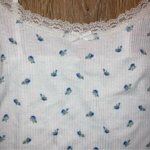-Rebellious Dreamer White Blue Floral Print Tank Top. This cute and comfortable ribbed tank features a delicate blue floral pattern throughout and a pretty lace trim along the neckline. Perfect for casual wear, layering, or as a stylish top.