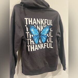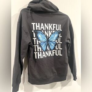 Sometimes all your weekend is missing is the perfect sweatshirt. Rebellious One's long-sleeve hooded sweatshirt features a Thankful graphic at back and a kangaroo pocket for extra storage or to warm your hands on a brisk day.