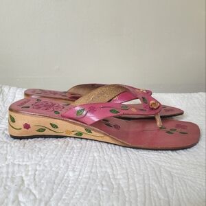 Sun-washed pink leather + hand-painted florals = the cutest boho flip-flops for market days and music nights. Soft square toe, low wedge edge, and that artisan, barefoot-at-heart feel. New without box (light shelf wear—see pics). Made in Thailand.