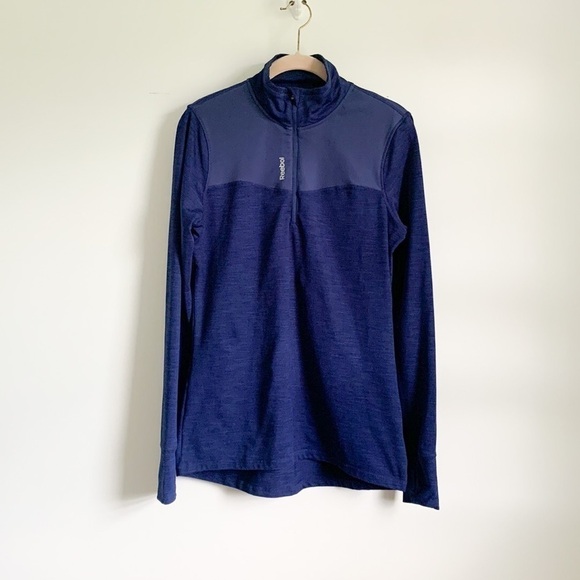 Reebok Blue Long Sleeve Quarter Zip Athletic Top. Size Medium (the care tag says S/Ch but I don’t know why. Must have been mistakenly sewn onto a size medium during manufacturing). Very stretchy material. Thumb holes at cuffs. Fine mesh overlay at the top front and top back. “Reebok” lettering started to come off from the wash, but it’s in overall great condition!