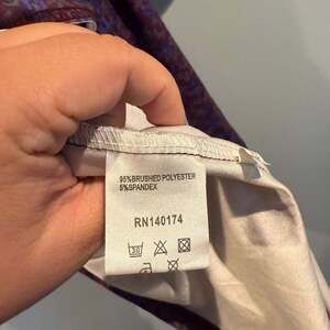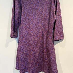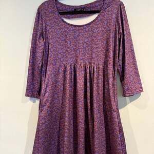 Reborn purple floral print long sleeve, knee-length dress in excellent pre-owned condition. This soft and comfortable dress features a round neckline, 3/4 sleeves, and a gathered waist with discreet side pockets. Made from 95% brushed polyester and 5% spandex, offering a slight stretch for a flattering fit. The dark purple base is adorned with a delicate all-over light purple floral pattern, perfect for casual wear or dressed up for a special occasion. No stains or holes.