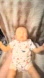 Realistic Reborn baby doll. Soft body with detailed features. Dressed in a white outfit with colorful patterns.